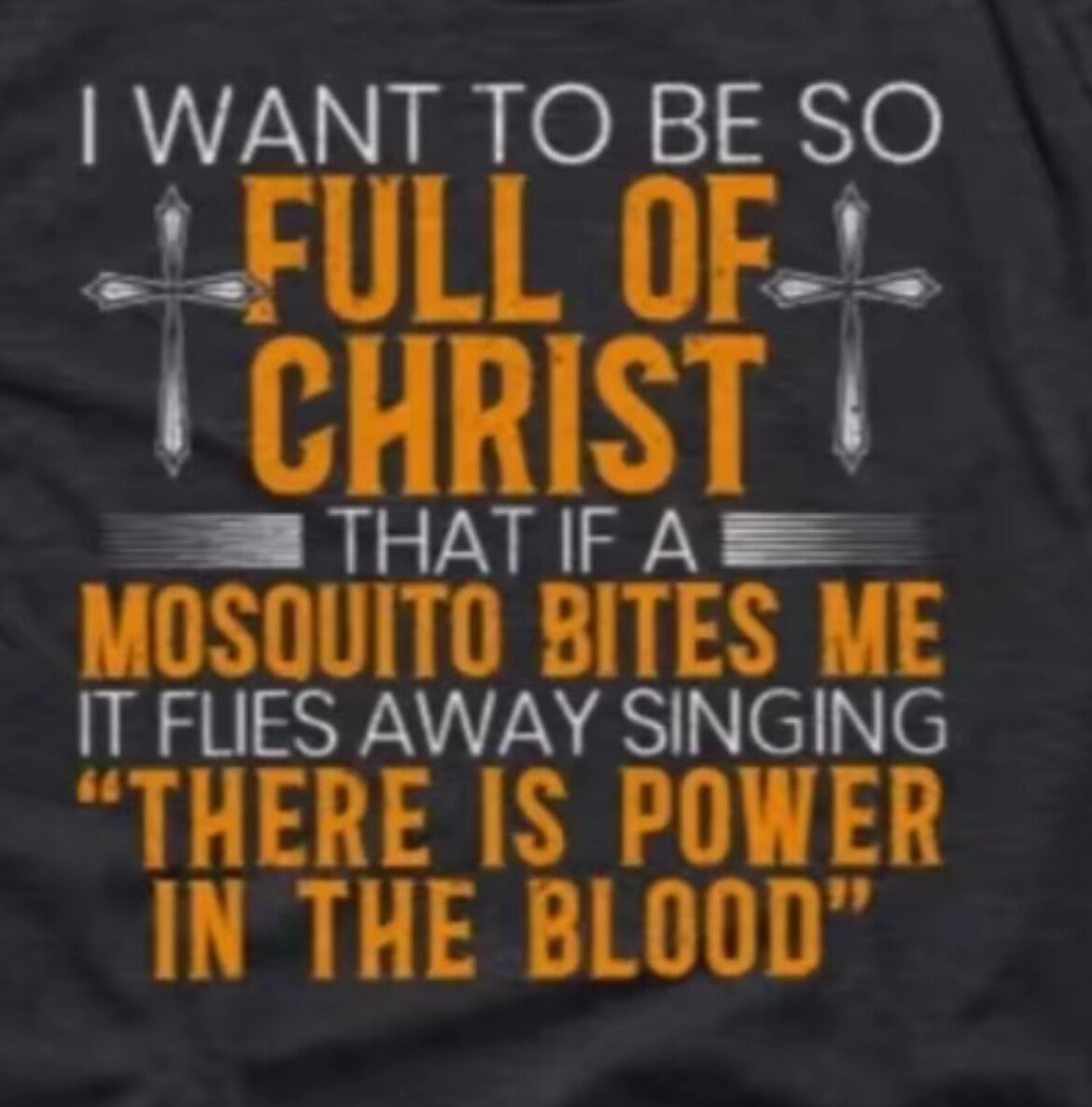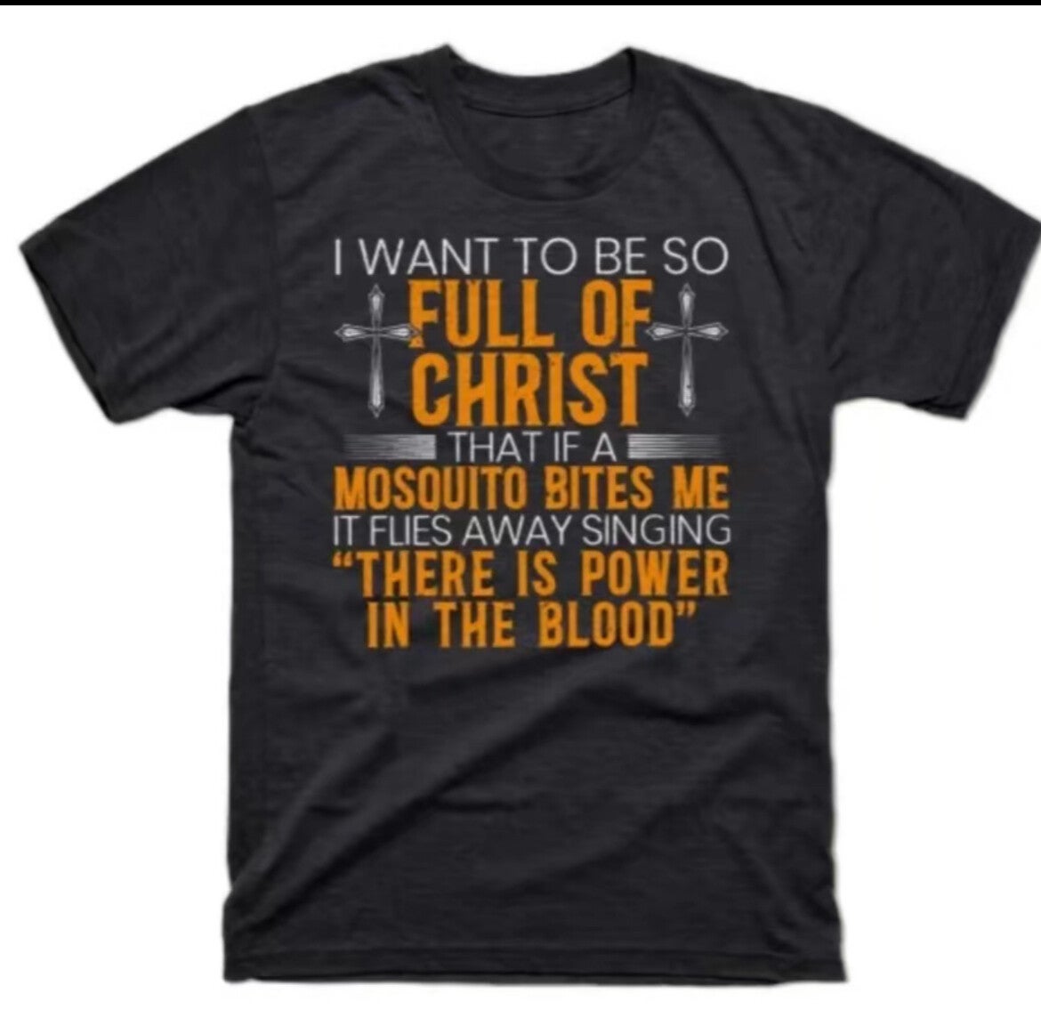 I WANT TO BE SO FULL OF CHRIST THAT IF A MOSQUITO BITES ME, IT FLIES AWAY SINGING "THERE IS POWER IN THE BLOOD TSHIRT