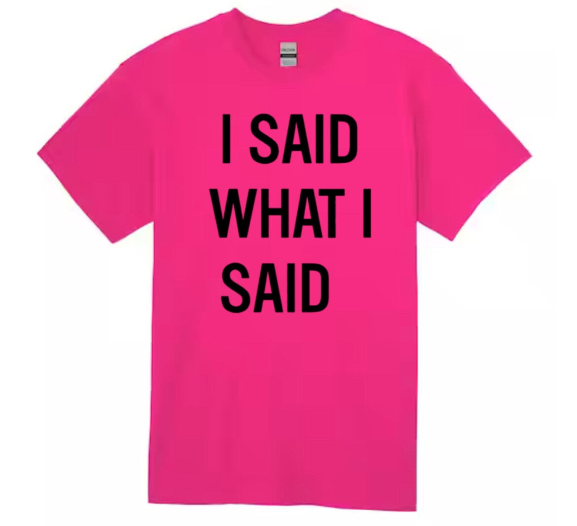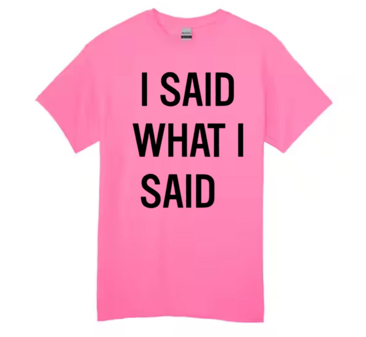 Perfect for those who aren't afraid to speak their minds, this t-shirt is sure to turn heads wherever you go. Crafted with high-quality materials, it features a comfortable fit and durable construction that will stand the test of time. The design is simple yet bold, featuring the phrase 'I said what I said' emblazoned across the front in eye-catching letters. Available in a range of sizes and colors, this t-shirt is suitable for both men and women who want to express themselves in style. Whether you're heading out on an adventure or simply running errands around town, our 'I said what I said t-shirt' will make sure everyone knows where you stand. Cotton Gildan.
