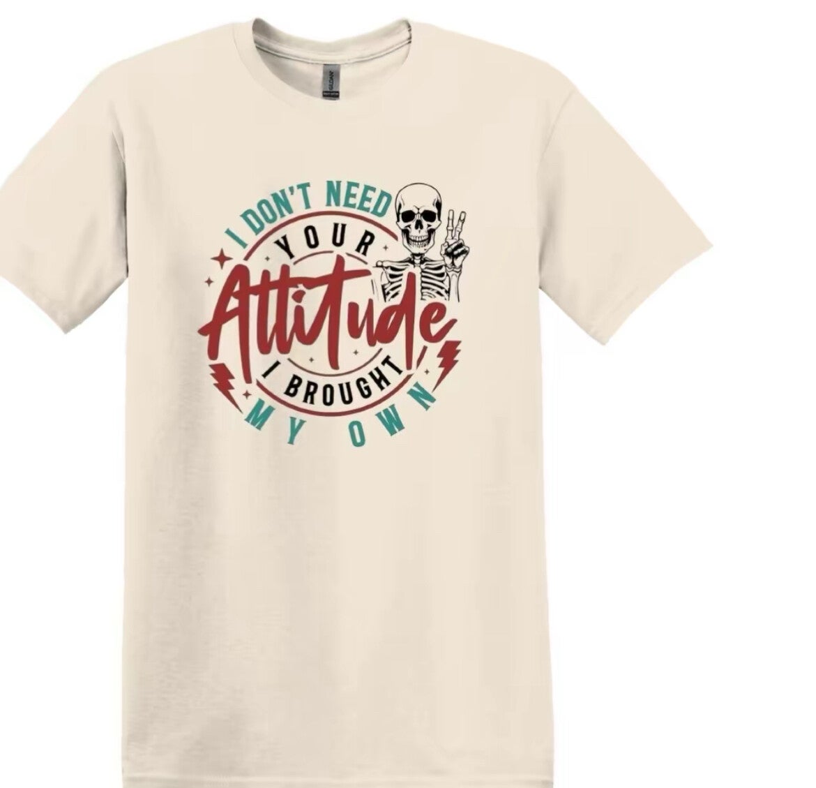 Cotton Gildan T-Shirt Don't need your attitude? Show it off with this unique product! With the catchy phrase "I brought my own", this product is perfect for anyone who doesn't take themselves too seriously. Quirky language, puns, and idiomatic expressions make this a fun and playful addition to any outfit.