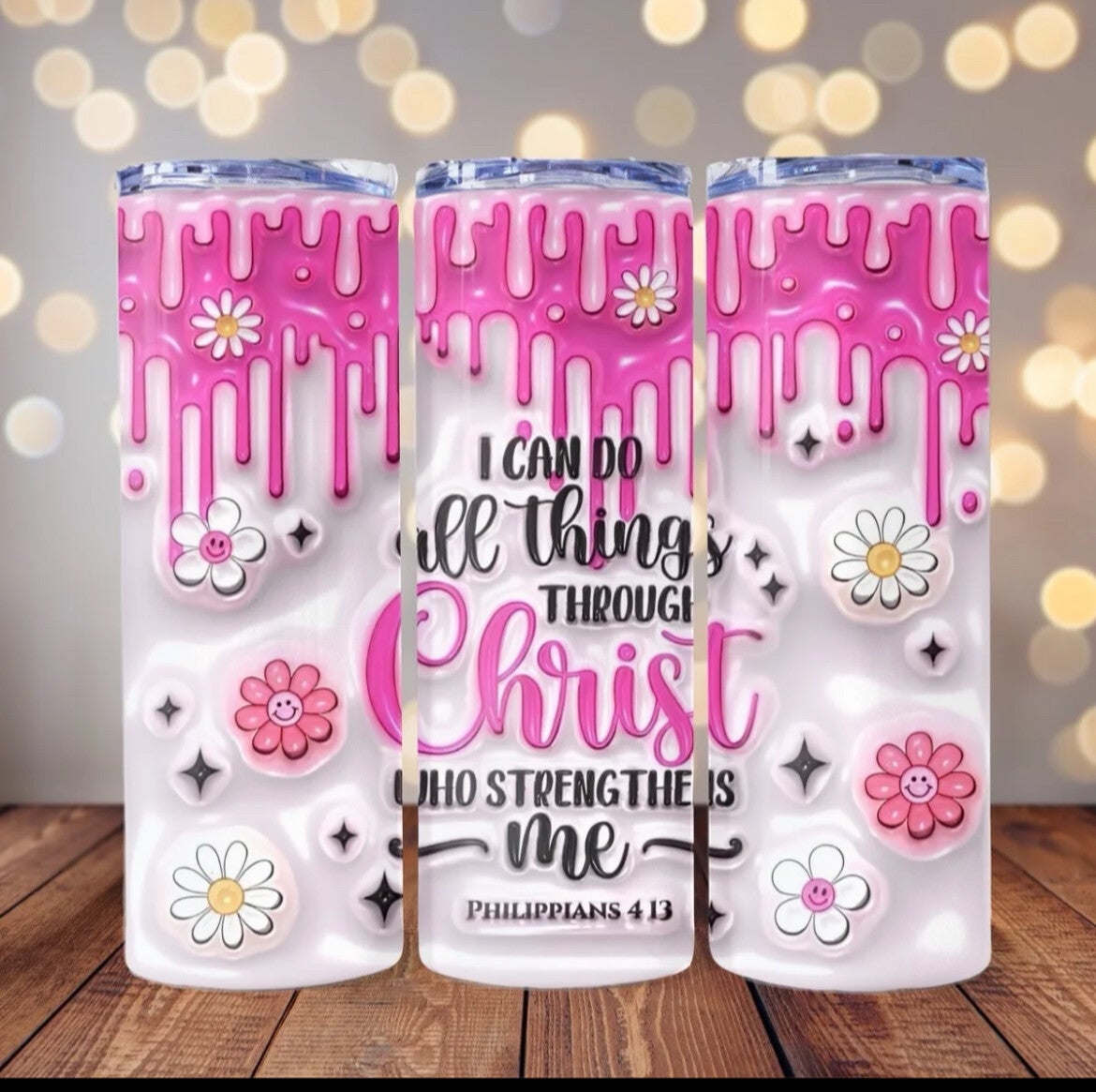 - 20oz Stainless Steel Tumbler Experience strength and inspiration with our "I can Do All Things" tumbler. With a powerful message and durable design, it's perfect for daily use or as a gift for loved ones. Keep your drinks hot or cold and keep your faith close with this tumbler at your side.