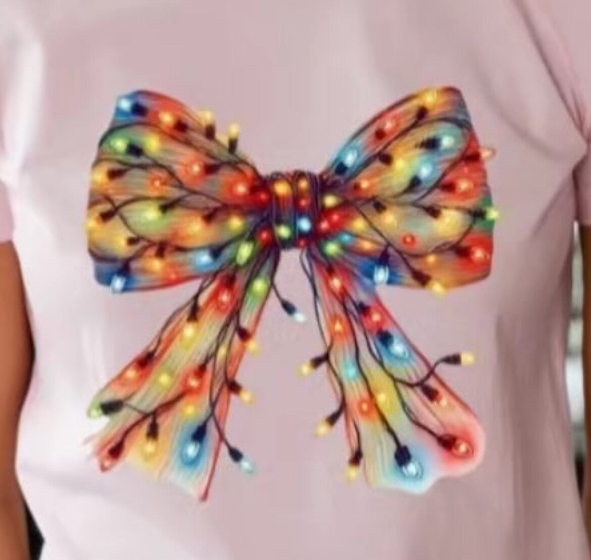 Get festive with this Christmas Bow T-Shirt! This unique design features a playful bow and twinkling lights, perfect for adding some holiday cheer to your wardrobe. (Tis the season for style!)