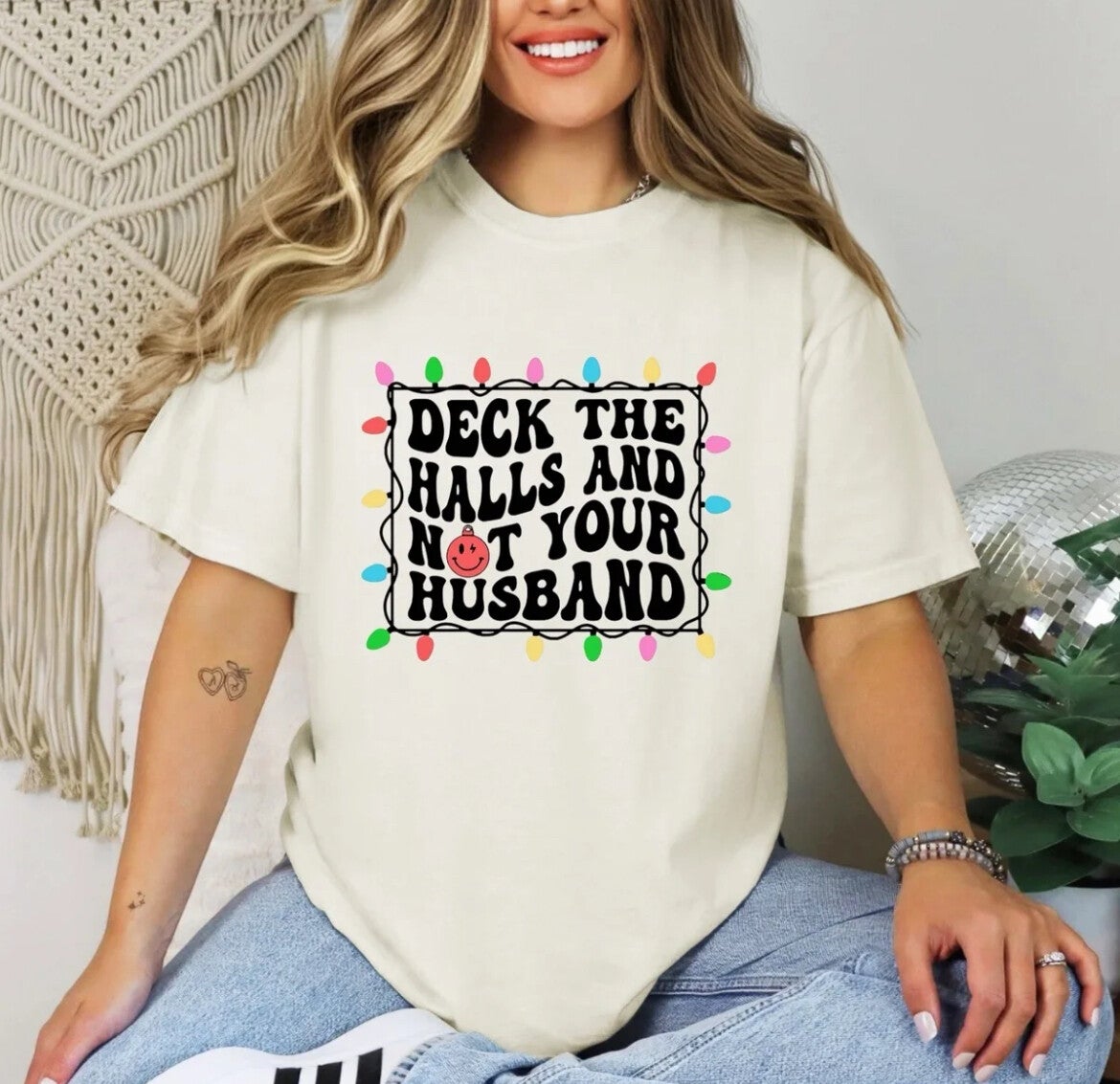 Gildan T-Shirt Celebrate the holidays and avoid any unwanted mistletoe encounters with this Deck The Halls Not Your Husband T-Shirt. Perfect for those who want to spread cheer without the fear of unwanted advances. (Don't worry, we won't tell your husband.)