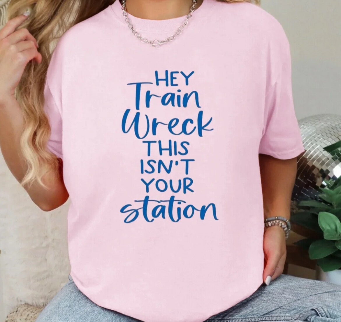 Looking for a fun and unique t-shirt? Look no further than our Hey Train Wreck This Isn’t Your Station T-Shirt! With its bold font and playful message, this shirt is both stylish and empowering. Show off your personality and let everyone know you're not stopping at anyone else's "station."