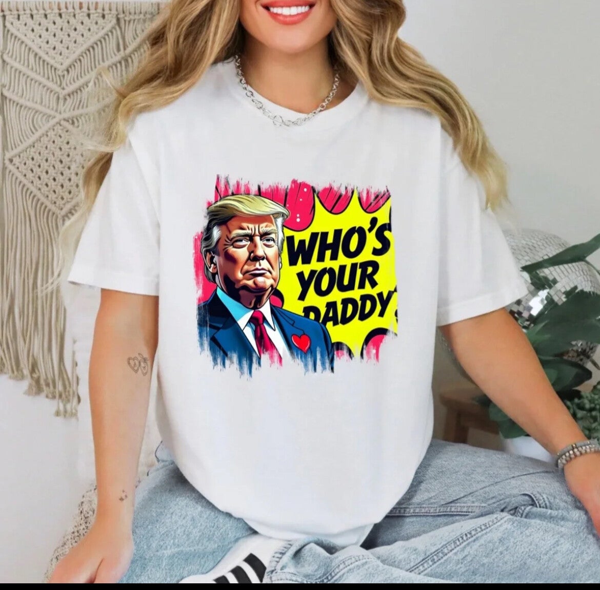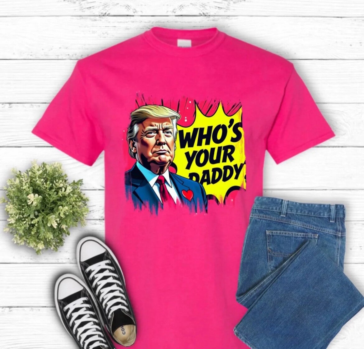 The t-shirt features a graphic design of Donald Trump in a comic book or cartoon style. The design includes a speech bubble that says "WHO'S YOUR PADDY" in large, capitalized letters. Trump's image is rendered with exaggerated features and colors, as is the comic-book style speech bubble surrounding him.