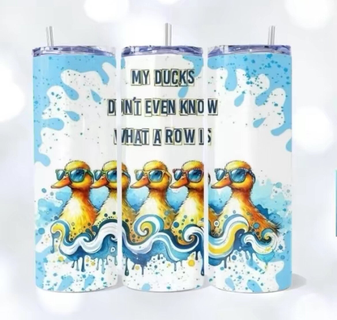 On the tumbler, an inscription is visible: "MY DUCKS" in a bold font, with the words "DON'T EVEN KNOW WHAT A ROW IS" written below it in a smaller font with block lettering.