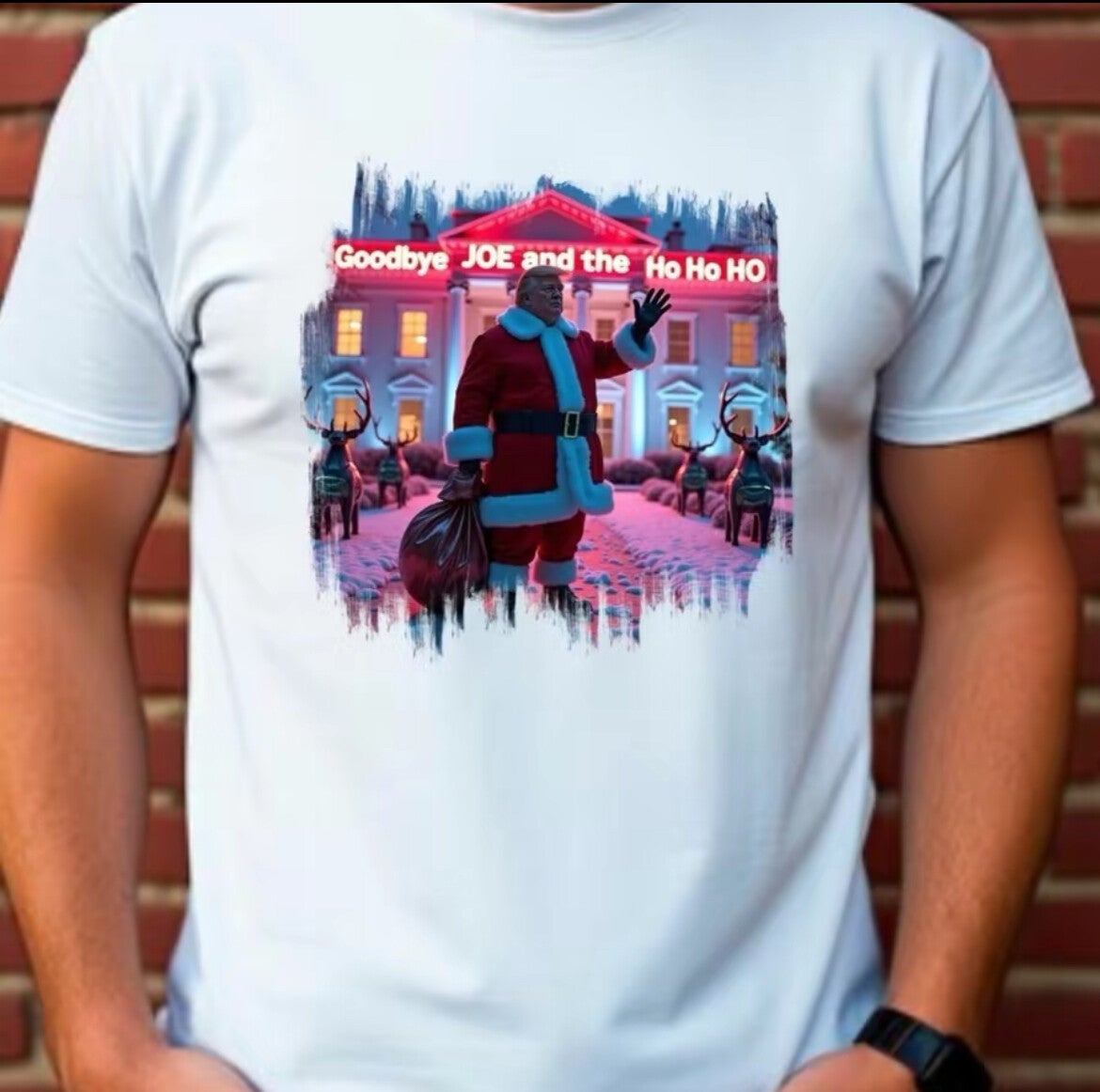 The words "Goodbye JOE and the Ho Ho HO" are in large, capital letters horizontally across the top of the image. Gildan T-Shirt