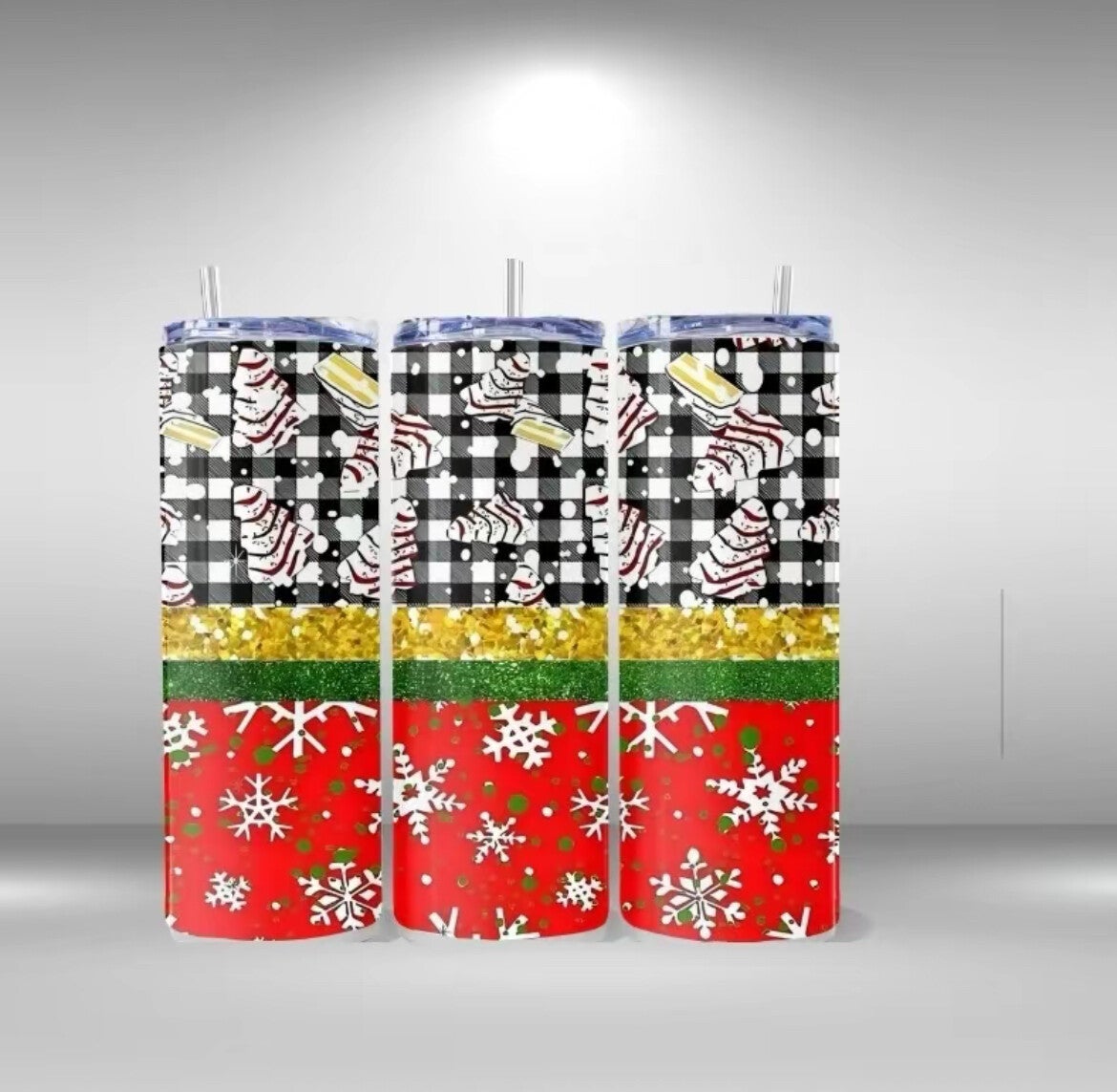 This tumbler features a multi-layered design. The top section of each tumbler showcases a black and white checkered pattern, with small red and white designs resembling Christmas tree ornaments or other festive decorations scattered on top.