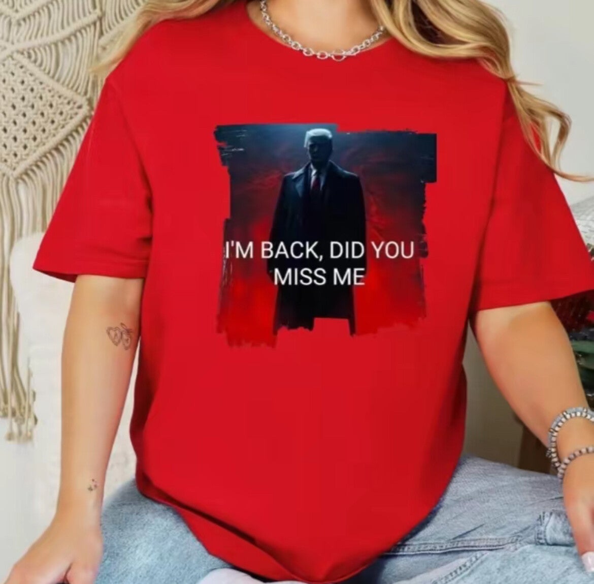 The t-shirt features a graphic design.Donald Trump in a dark suit and tie, is centrally positioned against a backdrop of red brushstrokes. The figure appears somewhat stylized or dramatic. The words "I'M BACK, DID YOU MISS ME" are printed below the image of the figure in a simple, sans-serif font, in white.