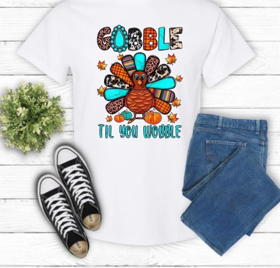 Gildan T-Shirt With GOBBLE TIL YOU WOBBLE and a Turkey.