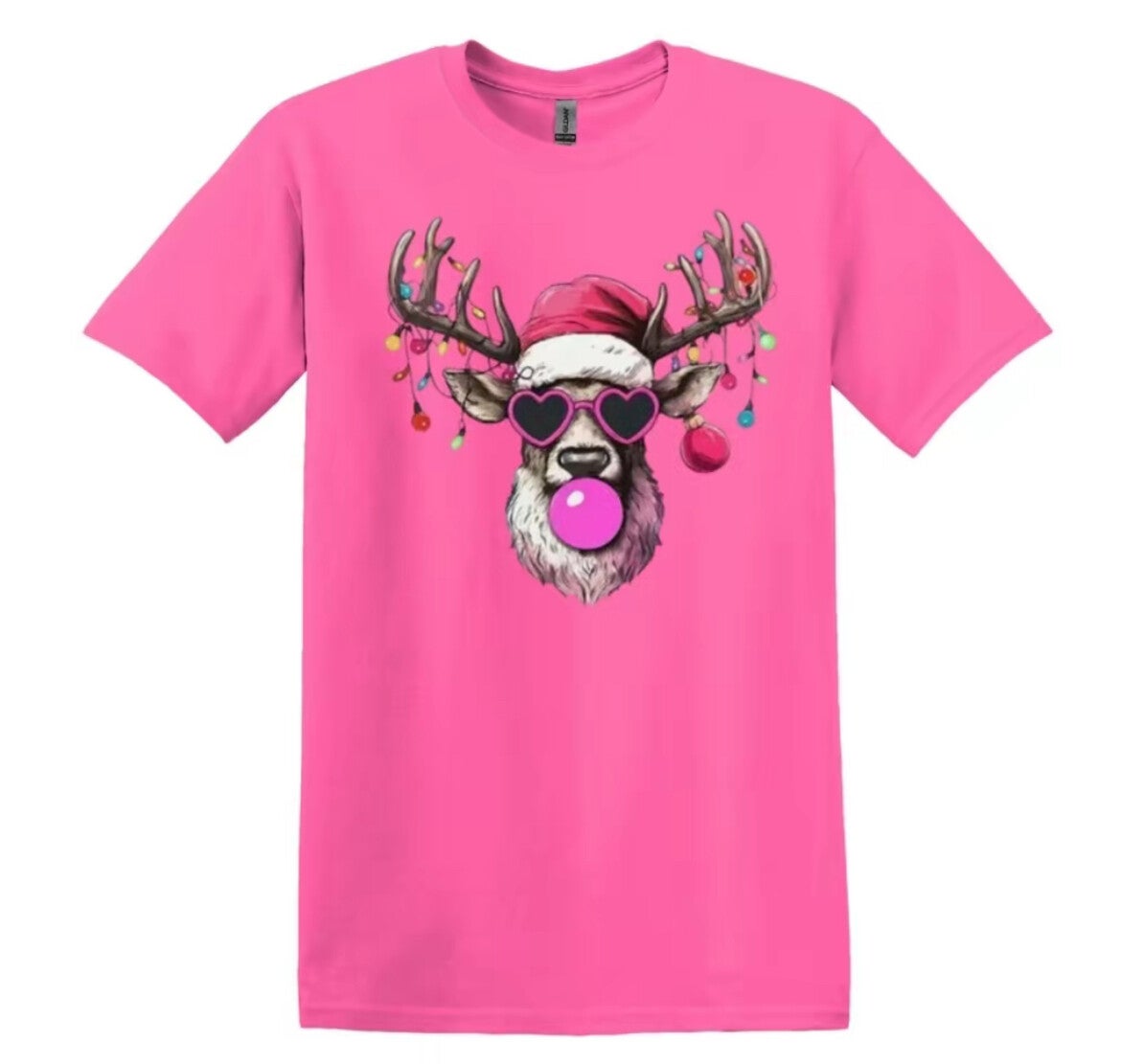 Christmas Deer Chewing Bubble Gum on a Gildan T-Shirt.
