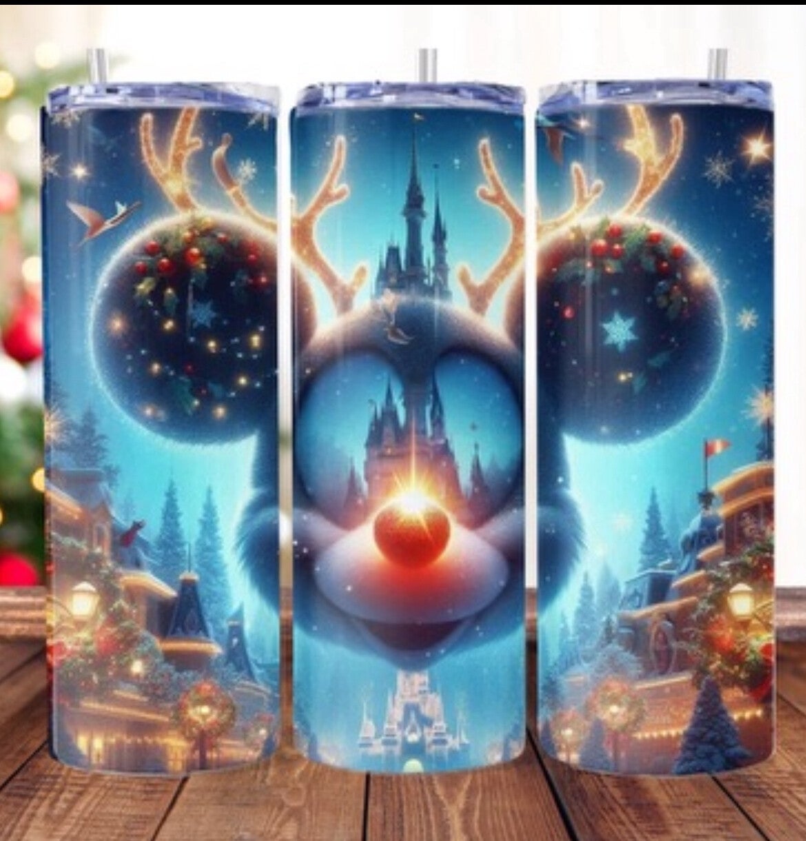 Mickey Silhouette With Antlers and a red Nose on a 20 oz stainless steel Tumbler