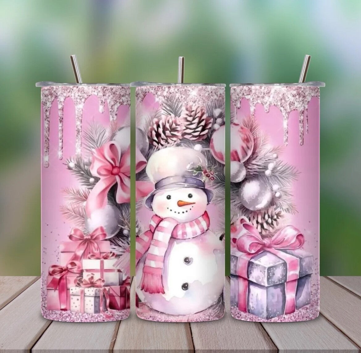 This tumbler has a design featuring a whimsical watercolor-style illustration of a snowman, adorned with a pink and white striped scarf. Christmas-themed elements surround the snowman, including pine cones, sprigs of evergreen, and festive gift boxes, all in shades of pink, grey, and white.