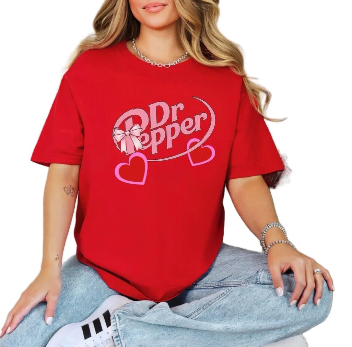 The Dr. Pepper logo is in a light pink oval shape with the words "Dr. Pepper" in a stylized, bold font. A pink ribbon bow is positioned above the words. Two red hearts, outlined in pink, are situated on either side of the oval, suggesting a decorative element around the Dr. Pepper logo.