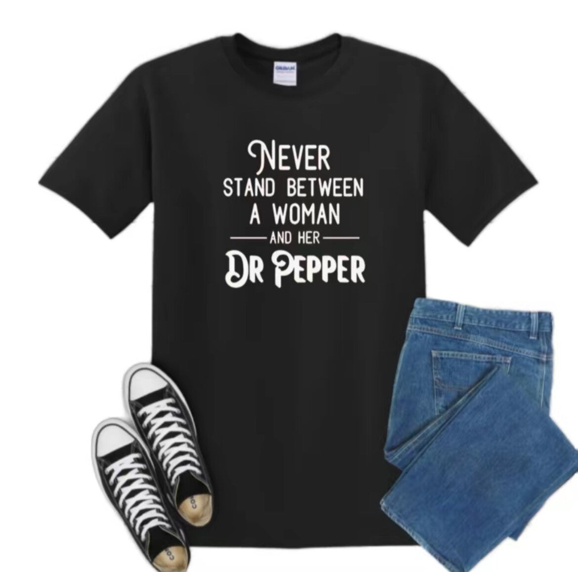 The shirt features a white graphic design that reads "NEVER STAND BETWEEN A WOMAN AND HER DR PEPPER" in a bold, sans-serif font.