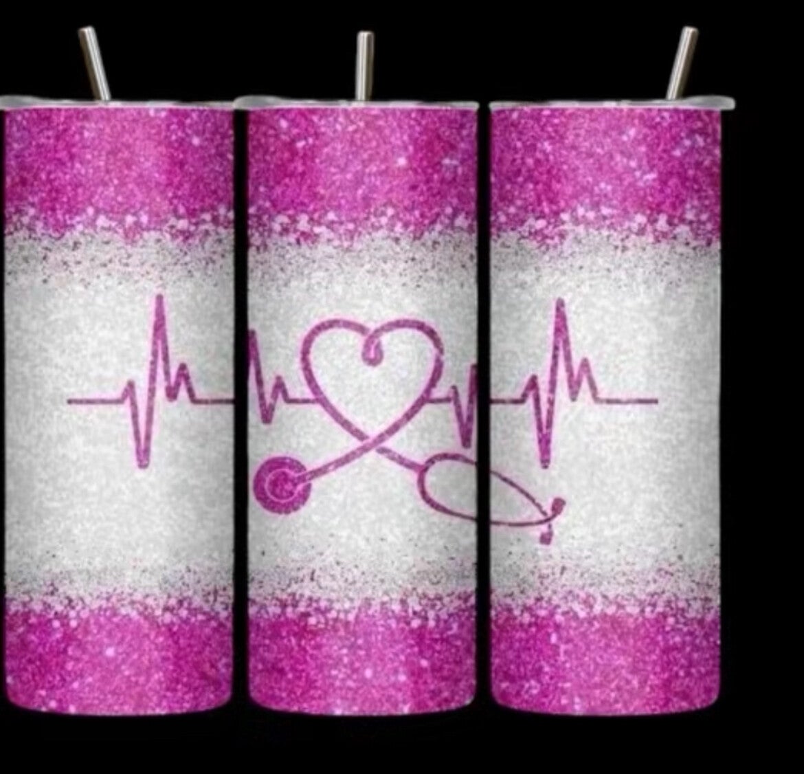 Pink and White Heartbeat Nurse On a 20 oz Stainless Steel tumbler.